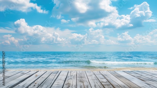 Calm sea horizon view from a weathered wooden platform, evoking tranquility