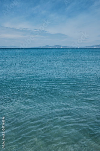 calm sea of turquoise color and some clouds in the blue sky, sailboats and mountains far away in the background