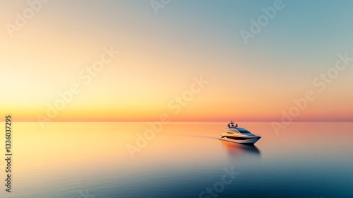 Calm seascape at sunset, serene water with a small boat silhouetted against vibrant orange and blue sky, ideal for relaxation themes.