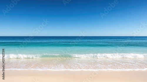 Calm tropical beach with gentle waves lapping at the shore under a clear blue sky Copy Space