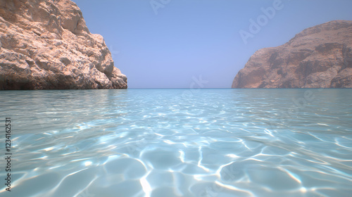 Calm turquoise sea between rocky shores. Summer vacation travel background