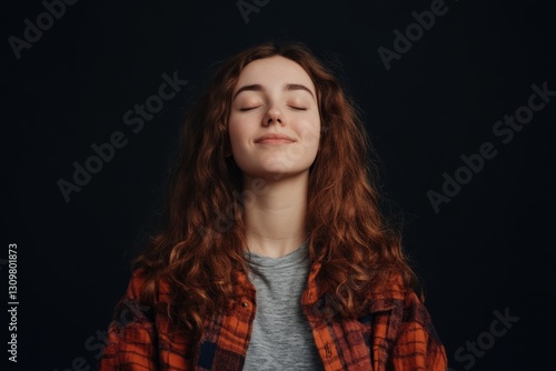 serenity, calm, young, woman, curly, hair, plaid, jacket, grey, shirt, peaceful, expression, dark, mindfulness, relaxation, emotion, portrait, happiness, comfort, introspection, personal, moment, calmness, joy, stillness