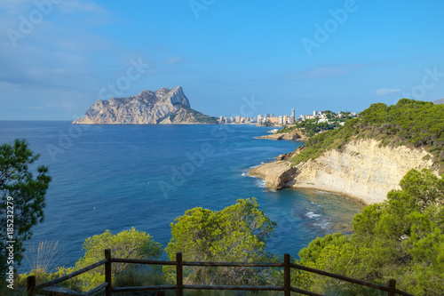 Calpe Rock seen from the Costa Blanca coastline between Calpe and Moraira, Spain.