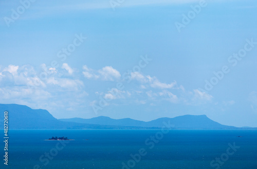 outdoors, day, sea, travel destination, nature, sky, horizontal, mountain, silhouette, scenic, copy space, blue, no people, cambodia