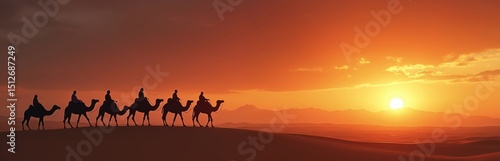 Camels silhouette against desert sunset. People riding camels on desert dunes, travel, tourism concept. Dramatic orange sun, hot, summer, travel adventure, african journey. Sahara travel vacation.