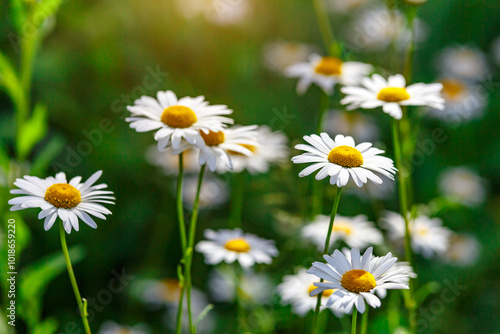 Camomile.Chamomile flower field.Field of camomiles at sunny day at nature.Spring, summer background. Meadow flowers. Medicinal plant.