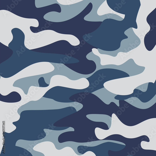 Camouflage pattern background. Classic clothing style masking camo repeat print. Blue, navy cerulean grey colors forest texture. Design element. Vector illustration.