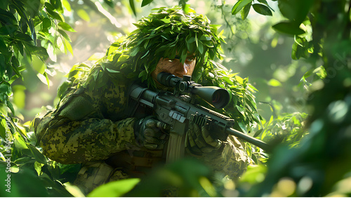 Camouflaged soldier aiming sniper rifle in lush green forest environment