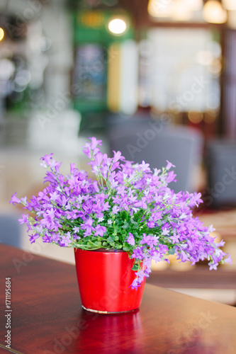 bellflower, purple, flower, pot, ceramic, red, green, floral, home, house, plant, wooden, table