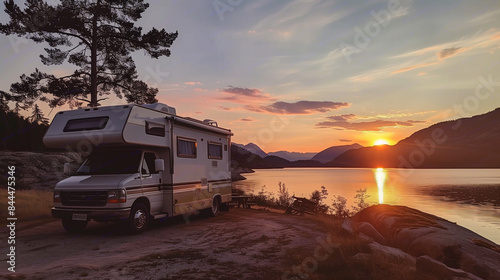 camper, van, lake, sunset, landscape, travel, recreational vehicles, recreation, camping, adventure, road trip, twilight, evening, nature, scenic, calmness, horizon, water, forest, peaceful, relaxation, wilderness, freedom, exploration, vacation, solitude, serene, dusk, get-away, wanderlust, beautiful, countryside, calm, panoramic, retreat, journey, summer, scenic view