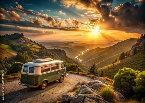 Camper Van on Winding Mountain Road, Dramatic Portuguese Landscape