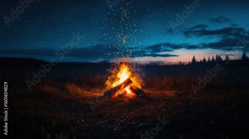 Campfire crackling under starry night sky, field, embers