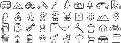 Camping and outdoor adventure icon set – hiking, backpacking, nature, RV, bonfire, travel, wildlife, trail signs, forest, tent