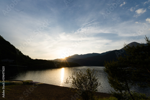 lake, water, sky, landscape, sunset, nature, cloud, blue, sunrise, mountain, sun, sea, stream, tonight, lovely, view, wood, calm, summer, horizon, forest, evening