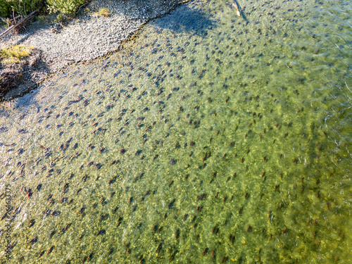 Canada, British Columbia, Aerial view of Adams River during salmon run