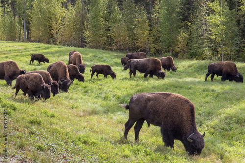 adult, bison, british columbia, buffalo, calf, eating, forest, grass, graze, herd, nobody, tree, young