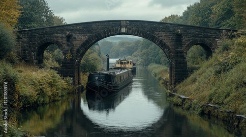 bridge, canal, boat, stone, arch, water, tree, foliage, overcast, cloudy, autumn, river, towpath, barge, transport, waterway, narrow, passage, dark, grey, yellow, nature, rural, landscape, historic, architecture, tranquil, peaceful, calm