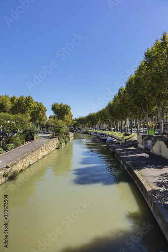 Canal de la Robine passes through the city of Narbonne; it connects the Aude and the Mediterranean Sea in the Aude department. Narbonne, Languedoc-Roussillon, France.