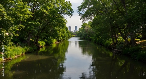 canal, waterway, tree, foliage, green, nature, still, water, lush, environment, peaceful, tranquil, landscape, day, photo, calm, scenic, vegetation, green tree, river, water reflection, building, city landscape, sky, nature scene, park, calm water, copy space, visual, image, exterior