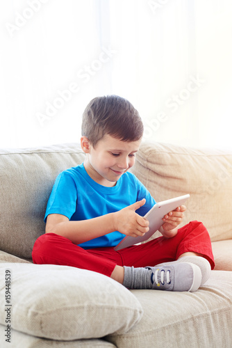 children, children, childhood, little, happy, caucasian, cute, young, person, white, small, male, leisure, sitting, background, playful, beautiful, smile, adorable, cheerful, home, red, blue, indoor, room, day, closeup, sofa, look, posing, using, tablet, play, game, technology, concentrated