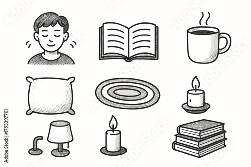 vector, icon, book, tranquil, rug, candle, mug, lamp, stack, mood, reading, book, open, cushion, rough, doodle, creative, set, artistic, ink, minimal, collection, crayons, hand-drawn, drawing, vignetting, outline