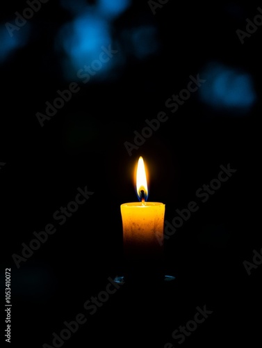 Candlelight Hope: A single candle flickers brightly against a backdrop of deep blue, symbolizing resilience, hope, and the enduring power of light in the face of darkness.