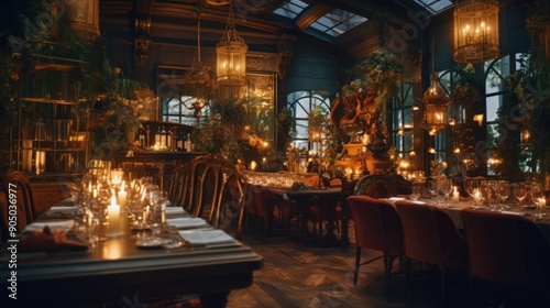 dinner, table, candle, eatery, chair, glassware, interior, greenhouse, elegant, formal, dining, lighting, warm, gold, wood, ornate, luxury, vintage, romantic, ambience, decor, setting, place, candleholder, centrepiece, artwork, grand, sophisticated, exclusive, style, design, space, atmosphere, event, gathering, celebration, occasion, night