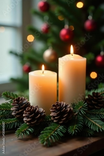 Candles burning amidst pinecones and evergreen, festive, branches, holiday atmosphere