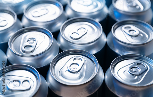 Cans of beer in brewery manufacturing setting with silver tops and blue background