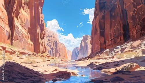 canyon, landscape, stream, blue, water, sky, sunny, cloud, rock, mountain, desert, sand, red, brown, stone, cliff, gorge, ravine, arid, sun, light, heat, day, nature, scenery, vista, view, picturesque, beautiful, scenic, amazing, breathtaking, wilderness, tranquil, serene, peaceful, calm, quiet, remote, secluded, untouched, pristine