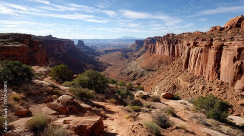 Canyon Landscape with Red Rock Cliffs and Vegetation