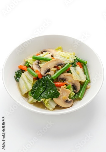 Capcay Jawa - stir-fried mixed vegetables with light gravy, served in white bowl isolated on white background. Colorful and balanced layout, top-down and side views.