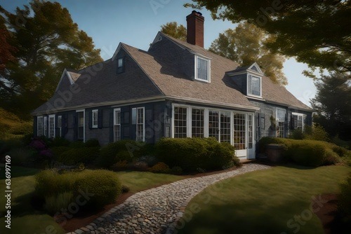Cape Cod-style house with shingles and a central chimney - AI Generative