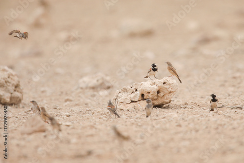 Cape sparrows standing together on a low branch in the Kalahari Desert