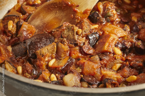 Caponata, a stew of eggplant, tomato, raisins and pine nuts, from Sicily, Italy