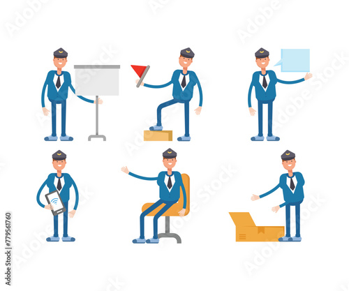 action, activity, avatar, business, cap, captain, cartoon, character, cute, flag, human, illustration, male, man, message, mobile phone, necktie, open box, people, person, police, pose, presentation, set, staff, standing, suit, vector, victory, succeed