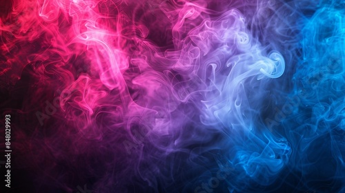 Captivating abstract photography featuring vibrant pink and blue smoke swirling against a dark background. A mesmerizing dance of colors and shapes.