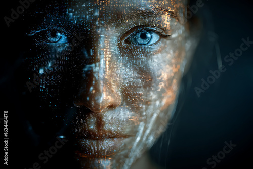 Captivating digital face constructed from glowing data points, symbolizing AI and future technology