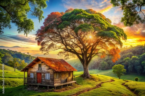 Captivating Double Exposure of Leafy Tree Landscape Merging with Rustic Wooden Dwelling in the Serene Rural Area of Southern Brazil, Showcasing Nature's Harmony and Tranquility