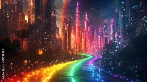 city landscape, fantasy, futuristic, skyscraper, architecture, neon, light, colours, vibrant, science fiction, surreal, landscape, urban, modern, digital, abstract, night, illumination, energy, technology, transportation, environment, atmosphere, aesthetic, dreamlike, mysterious, spectacle, dazzling, fiction, metropolis, illuminated, vision, imagination, concept, digital artwork, graphic design, visual, art, background