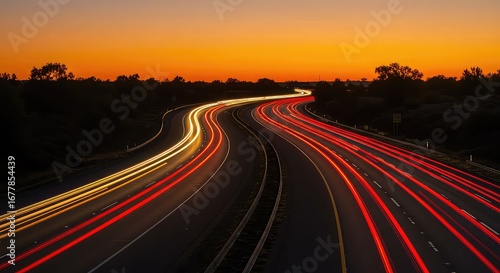 highway, traffic, light, trail, motion, speed, journey, travel, sunset, dusk, night, evening, transportation, vehicle, car, road, asphalt, commute, movement, energy, dynamic, blur, streak, red, yellow, orange, sky, landscape, dark, urban, rural, freedom, adventure, driving, destination, abstract, pattern, perspective, modern