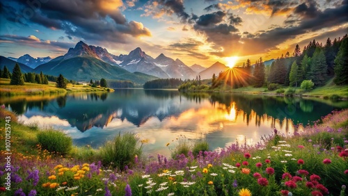 Captivating Landscape Photography Featuring a Serene Natural Setting Ideal for Music CD Covers, with Lush Greenery, Majestic Mountains, and a Tranquil Lake Reflection