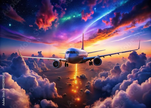 aeroplane, night time, flight, sky, cloud, aviation, travel, technology, digital artwork, night sky, aircraft, innovation, design, transport, high altitude, scenic view, modern, futuristic, beautiful, atmosphere, illumination, adventure, exploration, journey, city lights, air travel, landscape, aerial view, creative, unique, night photography, aerospace, flying, destination, panoramic, above the clouds, serenity, motion, elegance, ambience