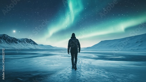 aurora borealis, aurora borealis, night sky, winter, solitude, cold, nature, journey, serene, wilderness, scenic, travel, exploration, horizon, glowing, person, outdoors, adventure, calmness, starry sky, peaceful, atmospheric, ice, natural phenomenon, beauty, immensity, silhouette, illumination, remote, aethereal, breathtaking, spectacular, midnight, isolation, enchanting, star, dark sky, calm, wonder, expansive, dreamlike