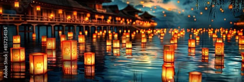 festival, lantern, ceremony, night, glow, floating, water, traditional, japanese, architecture, cultural, celebration, warm, vibrant, serene, tranquil, event, heritage, gloaming, illumination, scenery, ritual, harmony, festivity, soft, light, peaceful, ambience, spirituality, family, release, custom, radiant, meditation, oneness, evening, atmosphere, aethereal, landscape