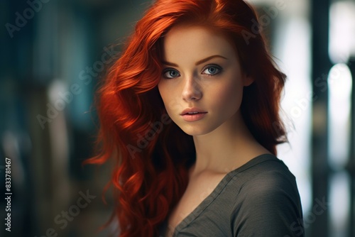 Captivating portrait of a young woman with vibrant red hair and gentle eyes, set against a blurred background
