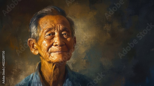 Captivating portrait of an elderly Asian man with a gentle smile, his face detailed with life's stories, set against a textured backdrop.
