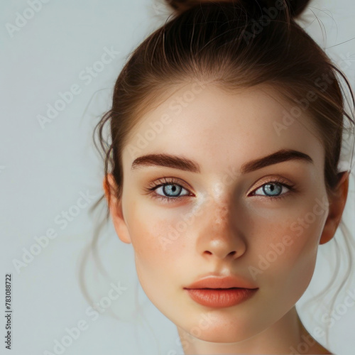 Captivating portrait showcasing a youthful woman with striking blue eyes
