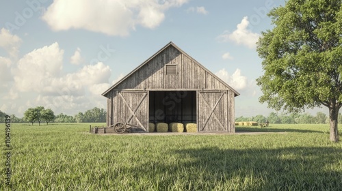 Captivating Rural Scene: Authentic Rustic Barn with Open Door, Farm Tools, and Hay Bales in Lush Field Surroundings