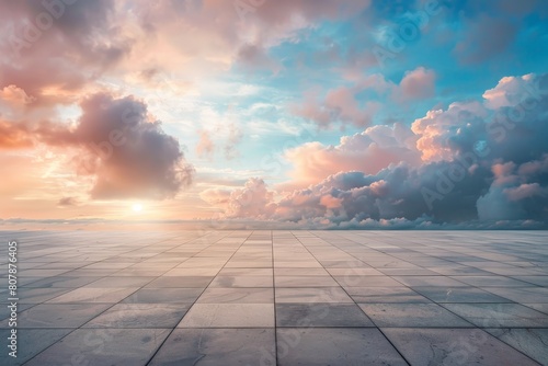 Captivating shot of an empty weathered road stretching towards a dramatic sunset horizon under a cloud-filled sky. Beautiful simple AI generated image in 4K, unique.